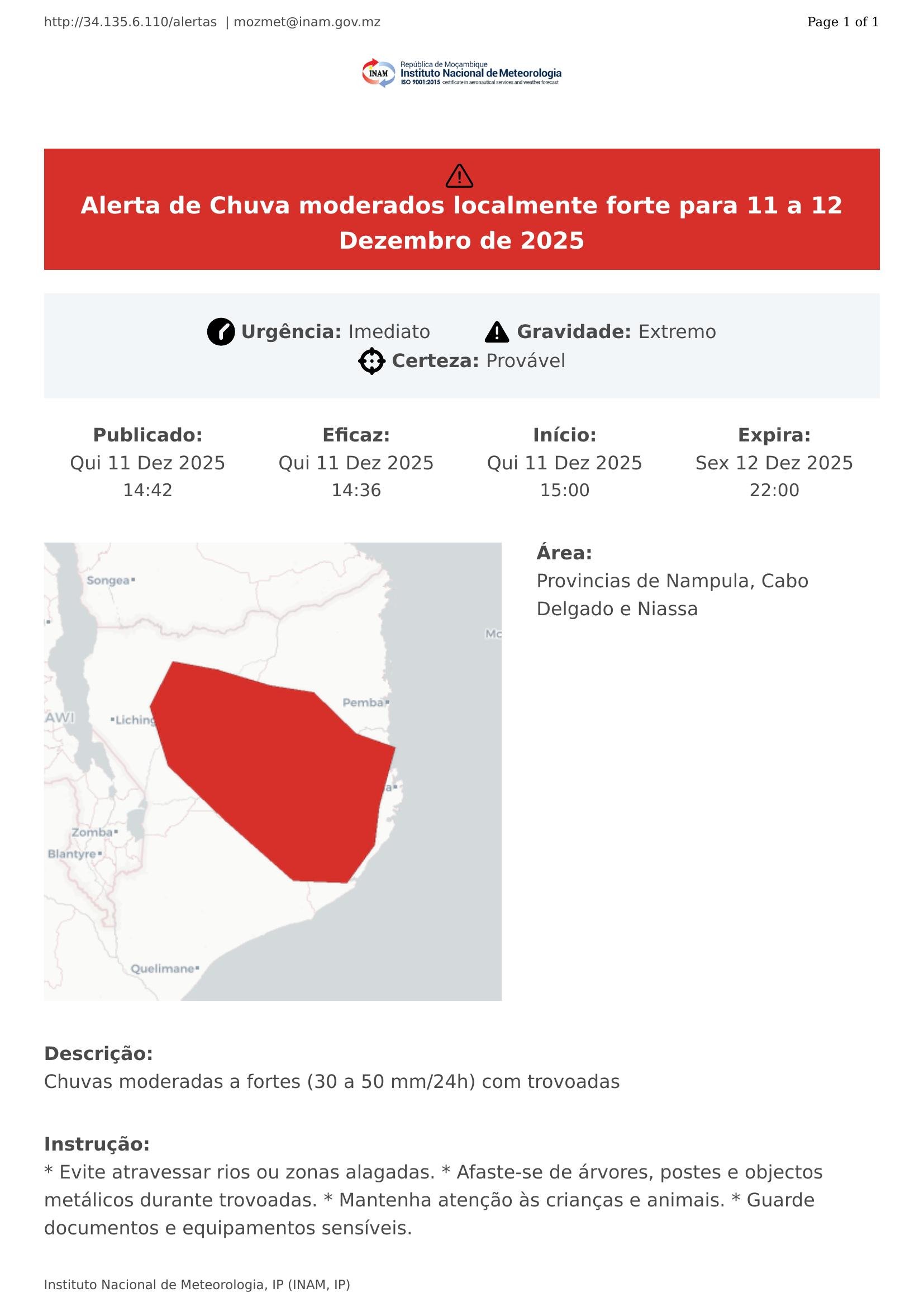 Alerta de Chuva moderados localmente forte para 11 a 12 Dezembro de 2025