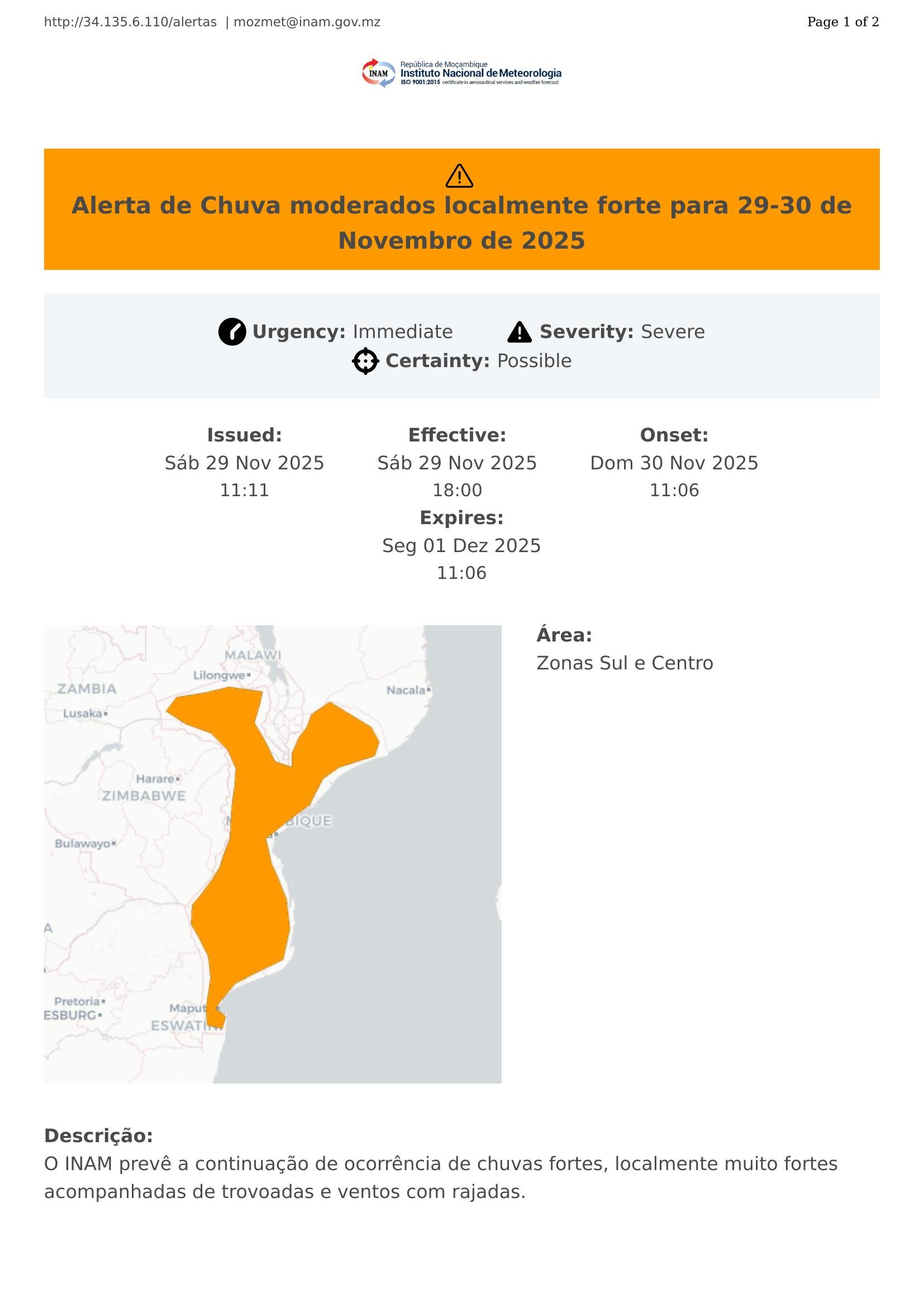 Alerta de Chuva moderados localmente forte para 29-30 de Novembro de 2025