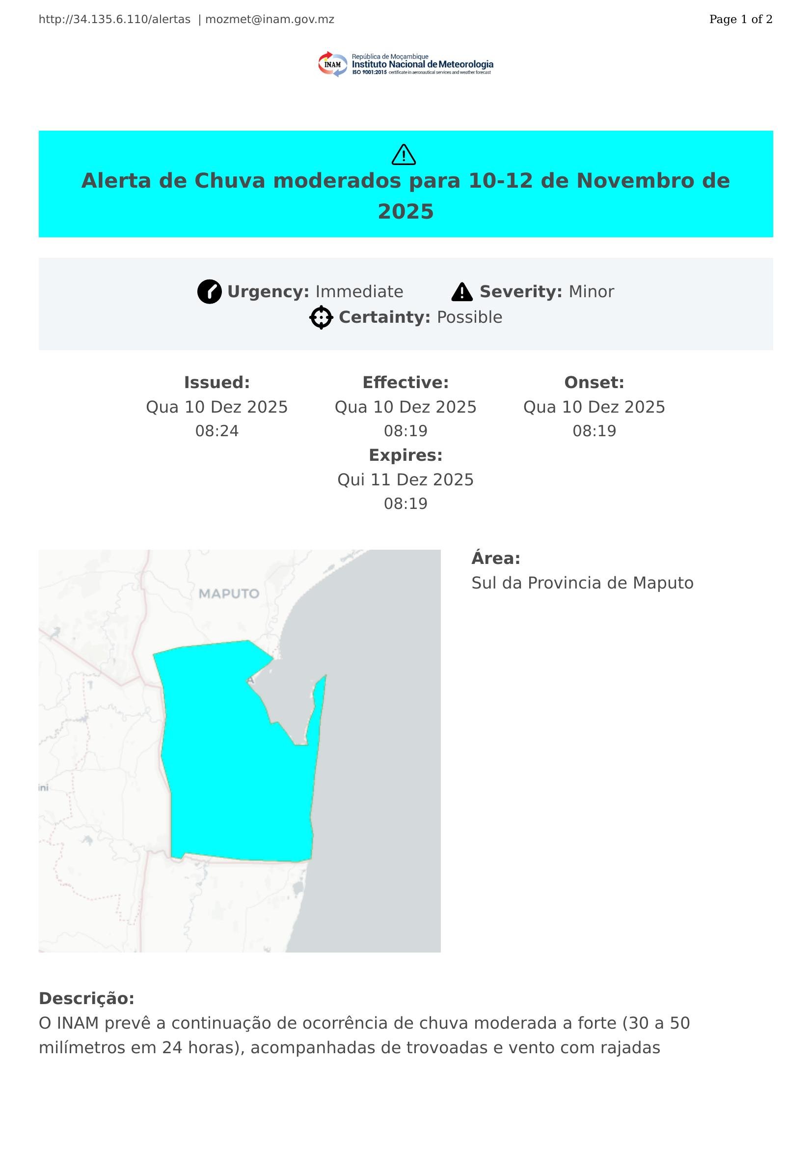 O INAM prevê a continuação de ocorrência de chuva moderada a forte (30 a 50 milímetros em 24 horas), acompanhadas de trovoadas e vento com rajadas
