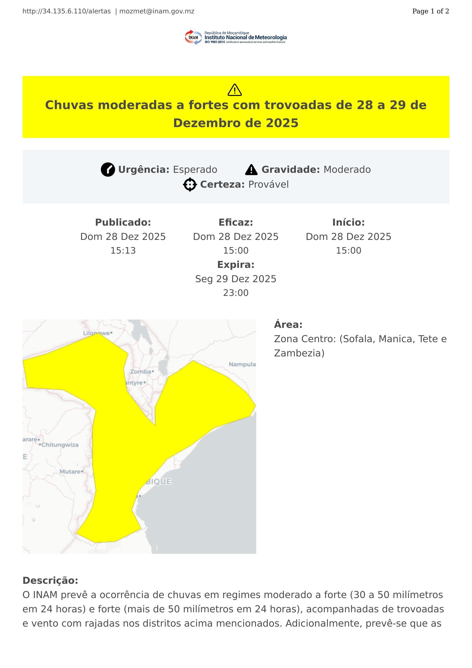 O INAM prevê a ocorrência de chuvas em regimes moderado a forte (30 a 50 milímetros em 24 horas) e forte (mais de 50 milímetros em 24 horas), acompanhadas de trovoadas e vento com rajadas nos distritos acima mencionados. Adicionalmente, prevê-se que as chuvas continuarão a cair de forma localizada nas províncias de Tete, Zambézia, Manica e Sofala.