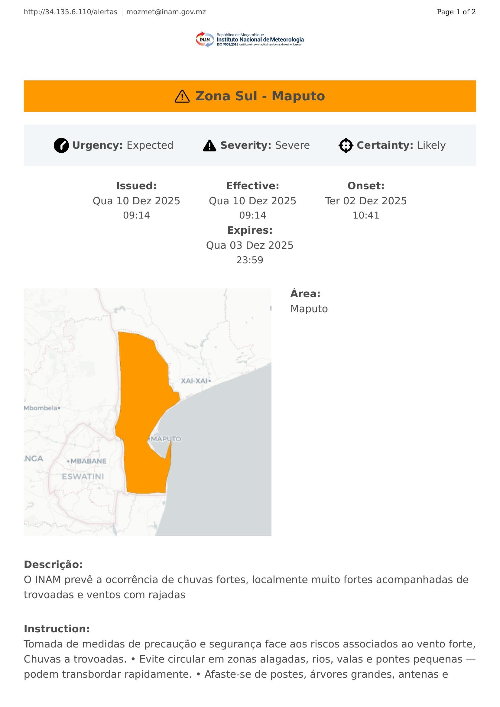 O INAM prevê a ocorrência de chuvas fortes, localmente muito fortes acompanhadas de trovoadas e ventos com rajadas